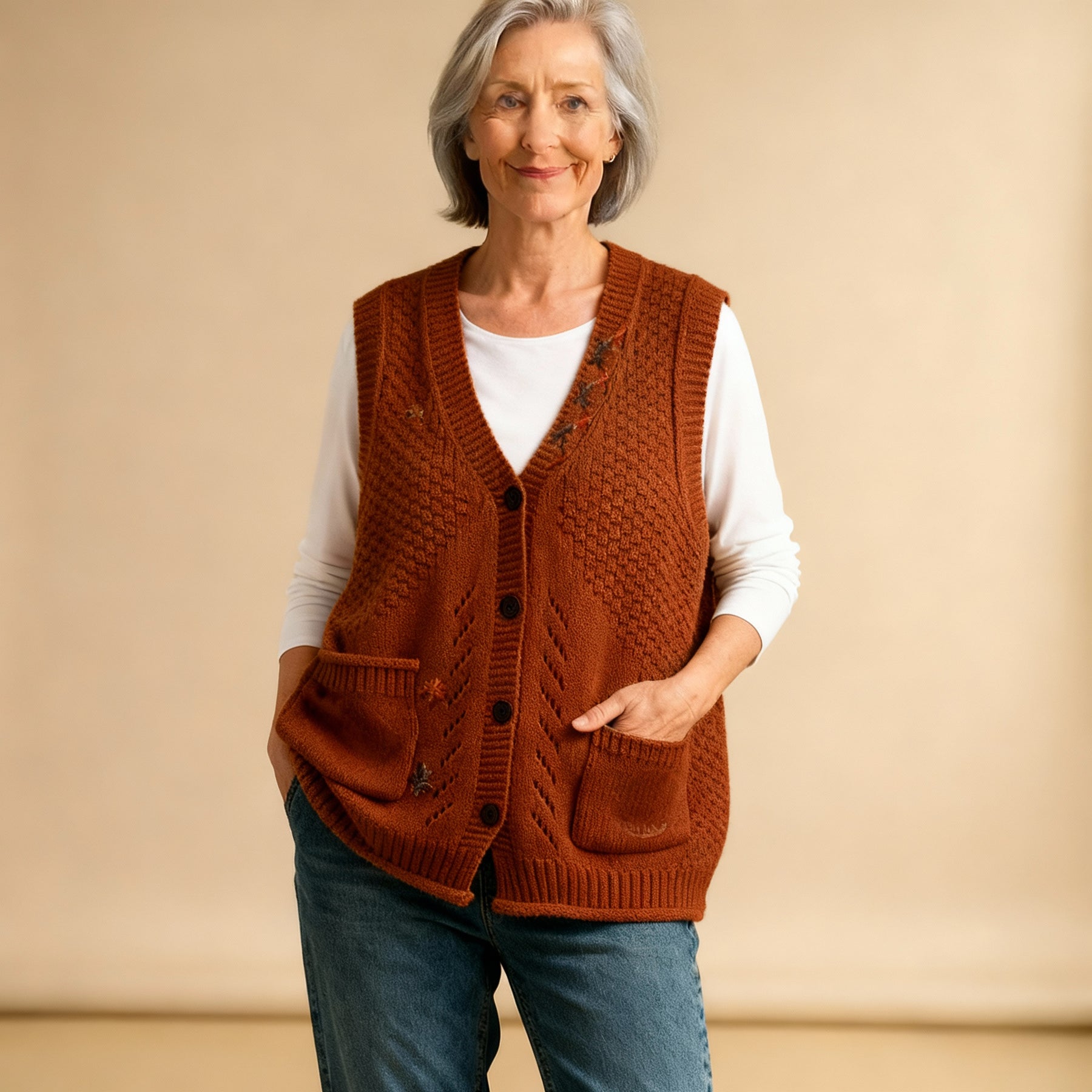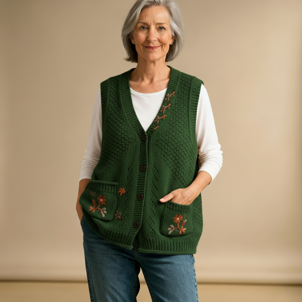 The Florianne Knit Vest is designed for women who appreciate comfort with a touch of charm. With its textured knit, delicate floral embroidery, and practical front pockets, this vest makes layering easy and stylish. Available in warm, versatile colors. It’s the perfect piece to add a soft elegance to your everyday wardrobe.