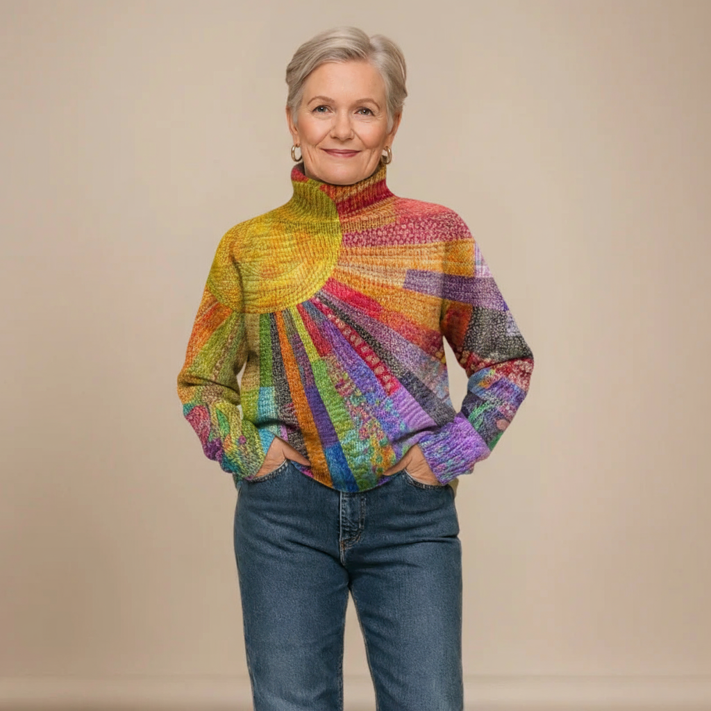 Colorful Sun Collage Print Knit Turtleneck Pullover Sweater
