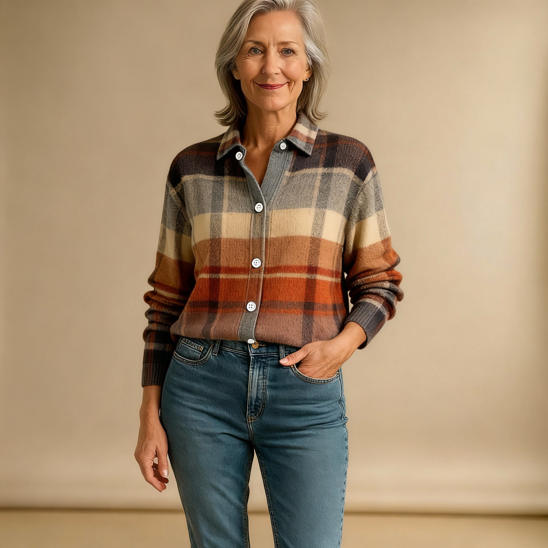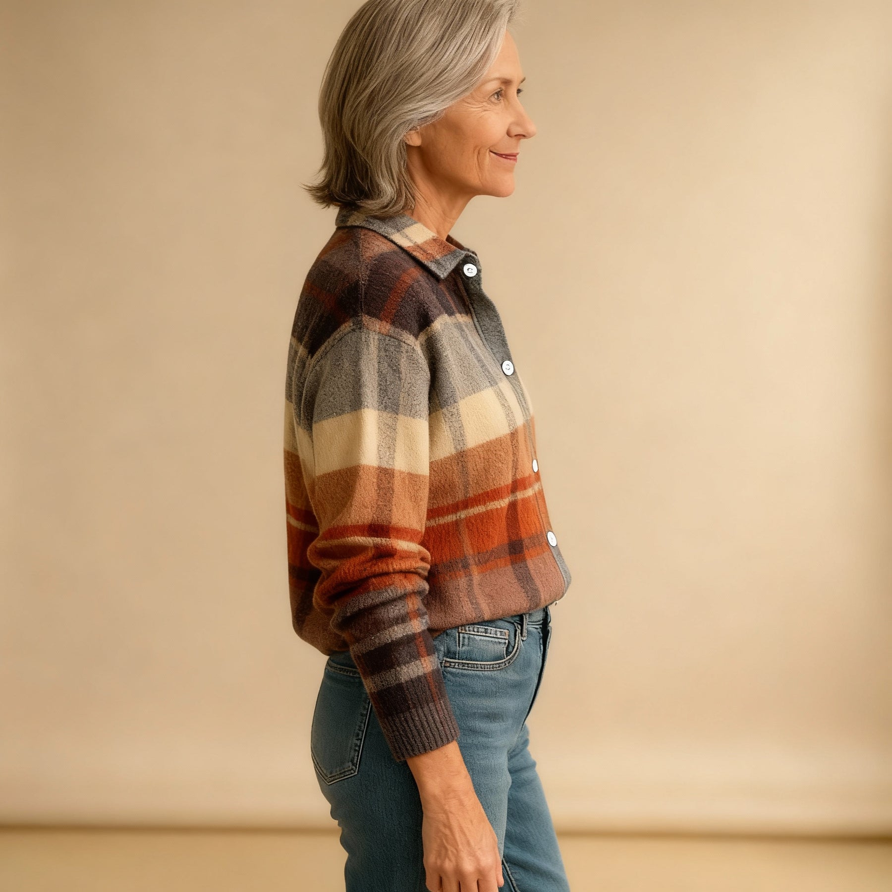 The Fleur blouse combines warm colors like rust, beige, and soft gray in a flowing check pattern that instantly gives off a cozy, natural vibe. The wide stripes create depth, while the matte wooden buttons add a refined and relaxed look to the overall design.