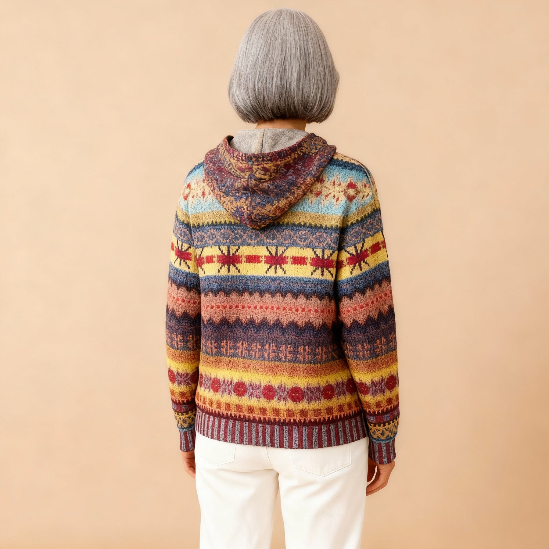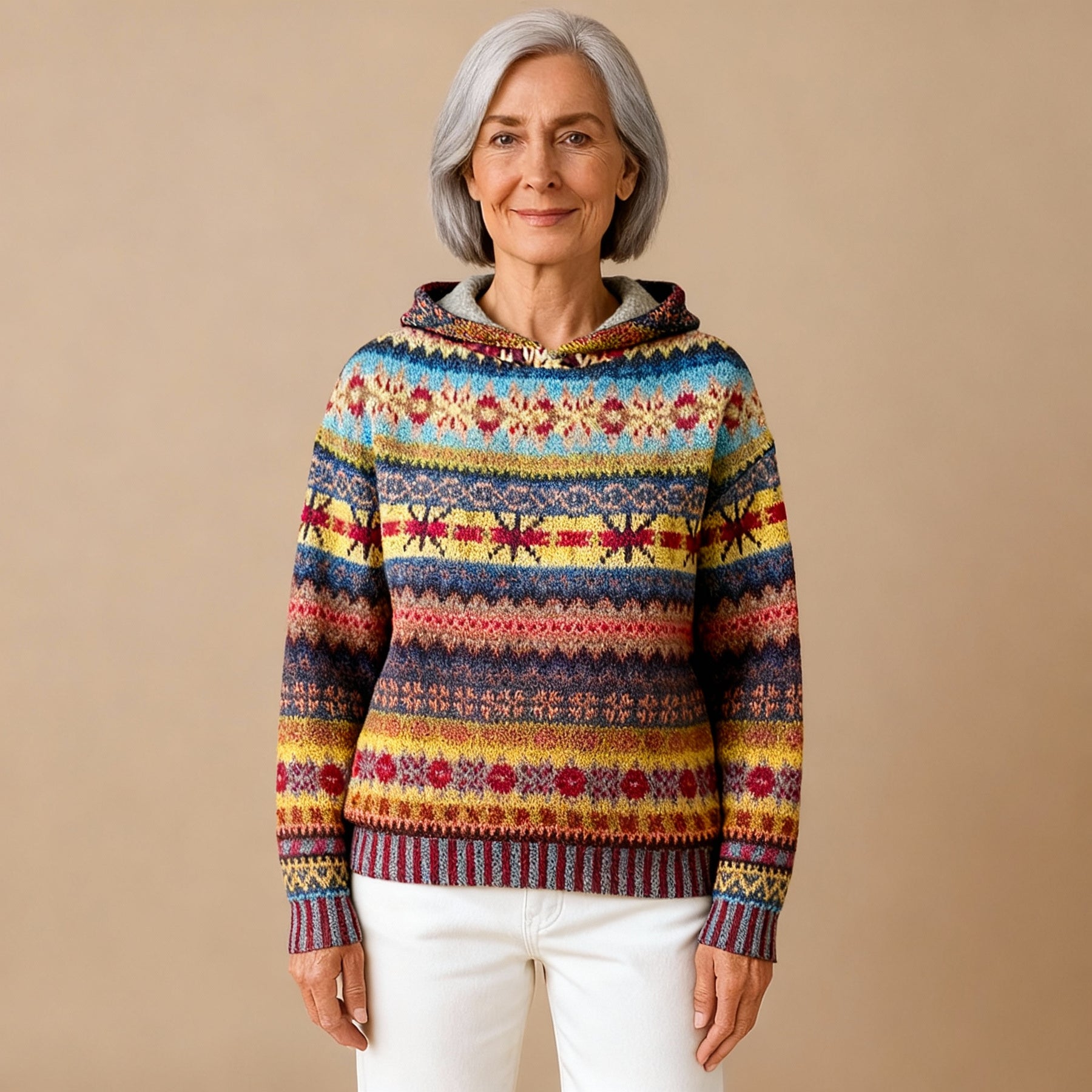 This knit doesn’t itch or irritate, thanks to a soft, breathable blend that feels gentle against your skin. It keeps you warm without overheating, ideal for the changing autumn weather. The material holds its shape, so no sagging or stretching after a few wears. The colorful, Scandinavian-inspired pattern adds a playful yet stylish touch to any outfit. Dress it down with jeans or shorts, or elevate it with a skirt and boots. The hoodie adds both extra warmth and a laid-back vibe.