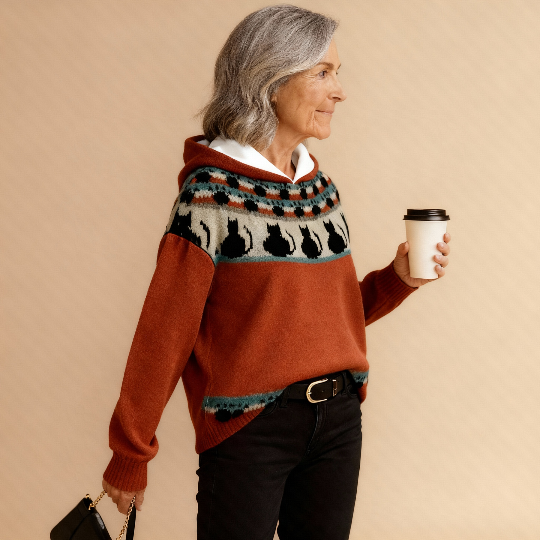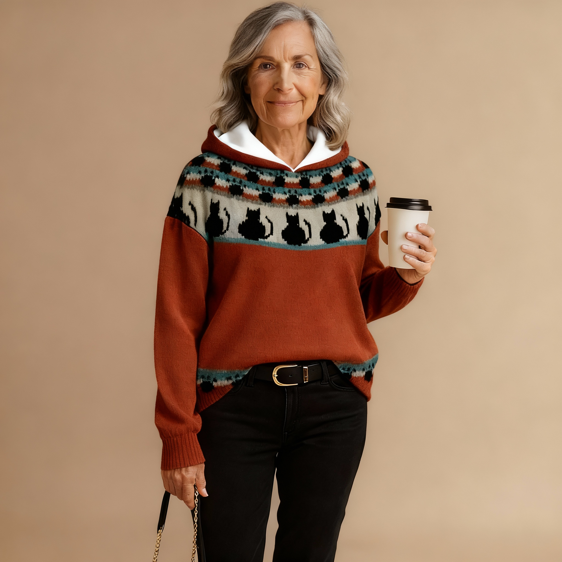 This knit doesn’t itch or irritate, thanks to a soft, breathable blend that feels gentle against your skin. It keeps you warm without overheating, ideal for the changing autumn weather. The material holds its shape, so no sagging or stretching after a few wears. The colorful, Scandinavian-inspired pattern adds a playful yet stylish touch to any outfit. Dress it down with jeans or shorts, or elevate it with a skirt and boots. The hoodie adds both extra warmth and a laid-back vibe.
