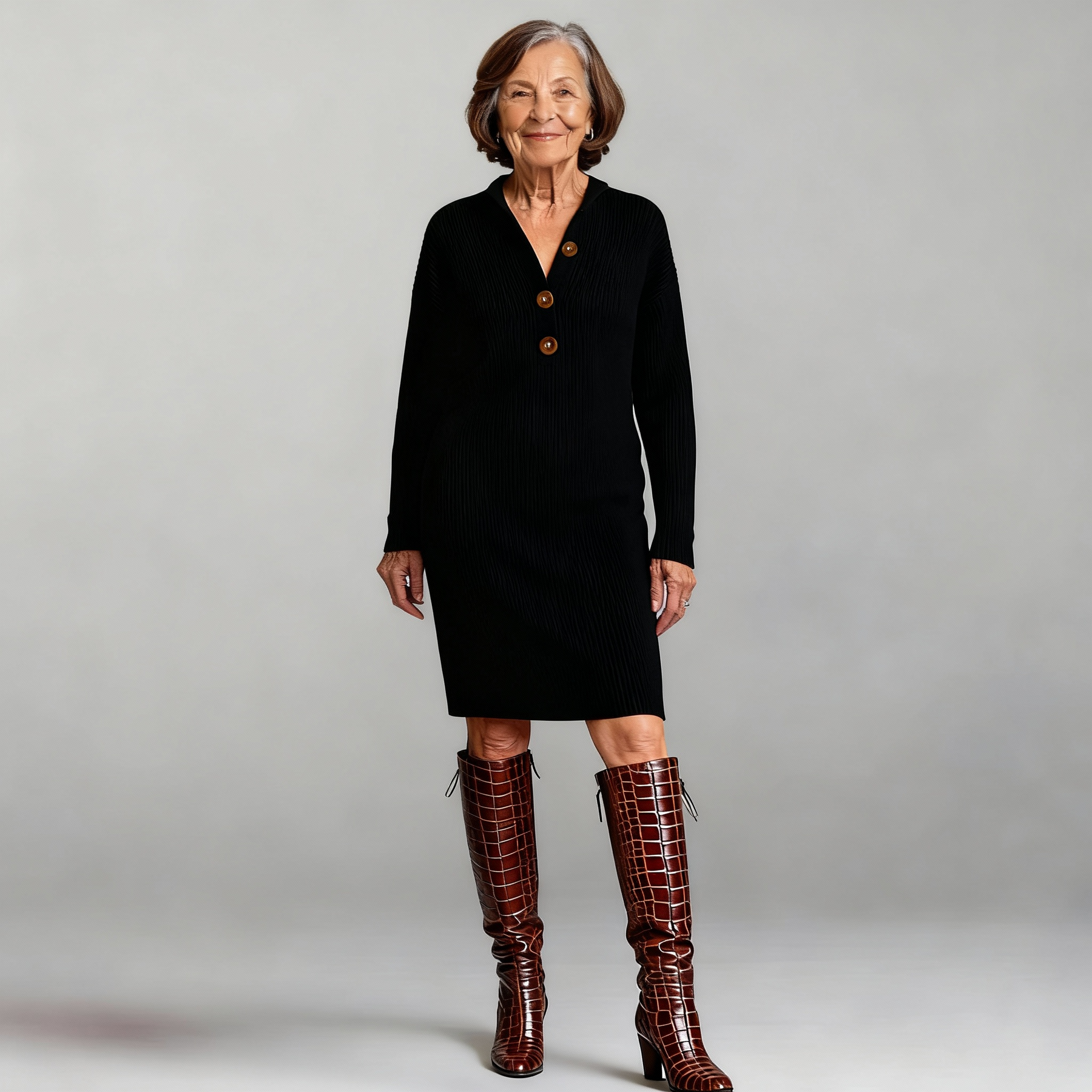 The Jane dress is the embodiment of winter elegance, combining comfort and style. Made from soft knit, it gently hugs the silhouette while providing a warm, enveloping feel. Its refined collar and decorative buttons add a touch of sophistication, perfect for cool days. Whether at the office, during an evening out, or just to feel beautiful every day, this versatile dress adapts to all occasions.