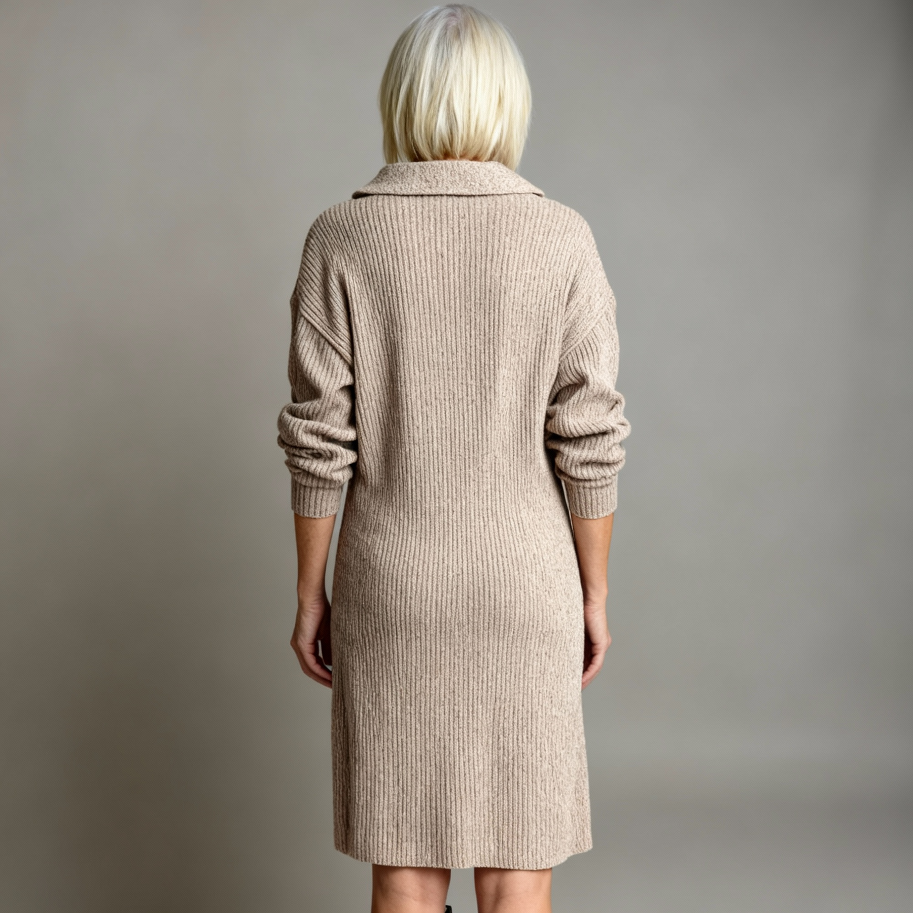 The Scarlett dress is the embodiment of winter elegance, combining comfort and style. Made from soft knit, it gently hugs the silhouette while providing a warm, enveloping sensation. Its refined collar and decorative buttons add a touch of sophistication, perfect for chilly days. Whether at the office, during an evening out, or to feel beautiful every day, this versatile dress adapts to all occasions.